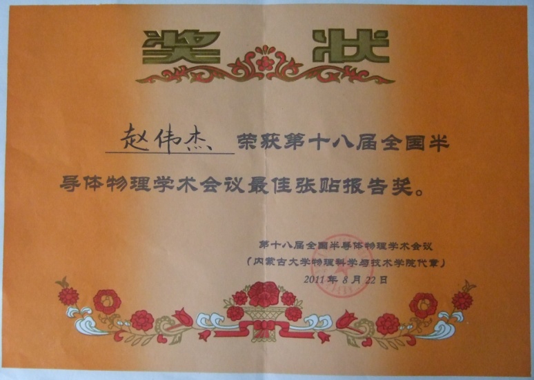 赵伟杰博士获第十八届全国半导体物理学术会议最佳张贴报告奖
