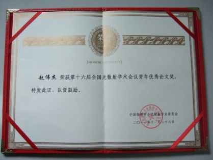 我室赵伟杰博士经过专家推荐,在会上做了三层石墨烯及其n型和p型插层化合物的制备和拉曼光谱表征的报告,被评为第十六届全国光散射学术会议青年优秀论文奖。