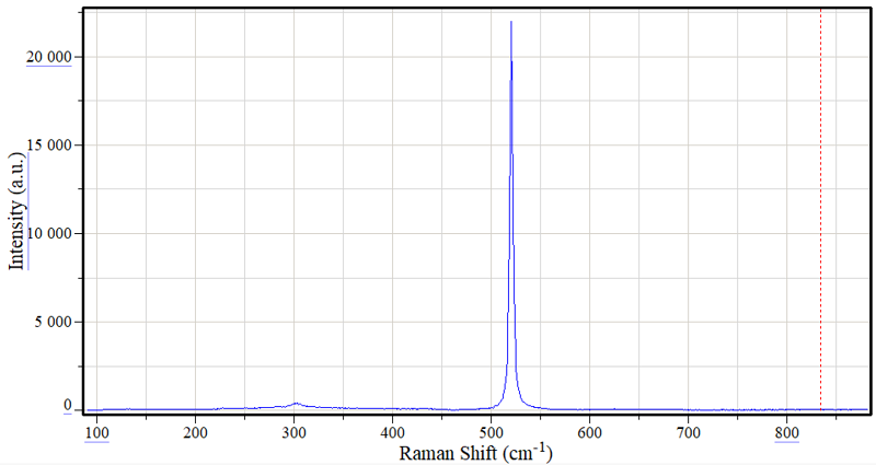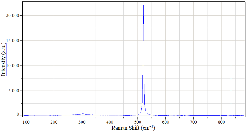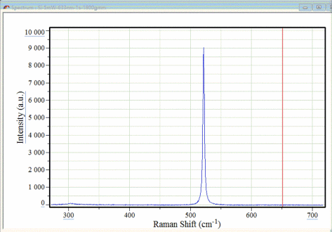 电子科技大学显微共焦模块拉曼谱仪实测结果,Si111样品,He-Ne激光器输出功率5mW,1800刻线光栅,狭缝宽度80微米,100倍物镜,积分时间1秒。